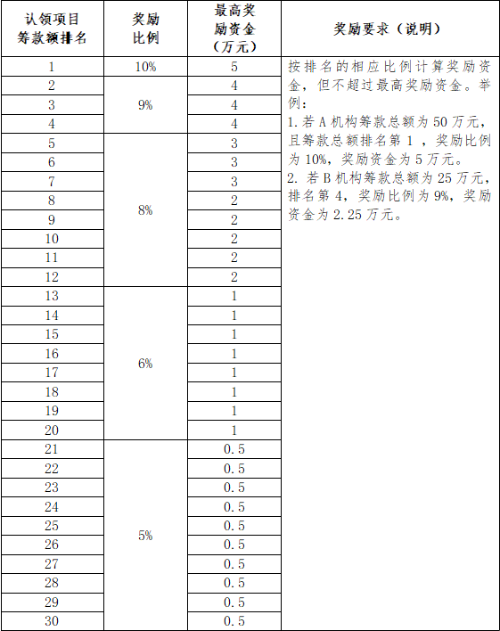 根据社会组织公益项目众筹情况,按5%-10%梯度比例提供非限定性工作经费奖励。社会组织获得的非限定性工作经费奖励,不限定用于项目执行,可用于社会组织运营与发展等非限定性方向。湖北省妇女儿童发展基金会依照《中华人民共和国慈善法》《基金会管理条例》相关规定,对认领的公益项目提取2%的工作经费。非限定性工作经费奖励标准详见下表:
