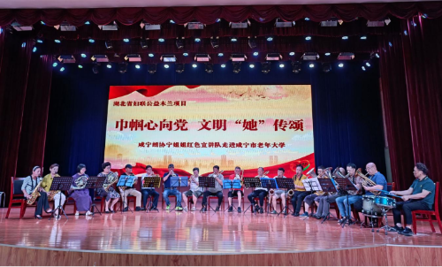 咸宁市朗诵艺术家协会的志愿者们组成宁姐姐宣讲队,先后走进咸宁市图书馆、咸宁市老人大学和泉塘社区,通过诗朗诵、乐团演奏、讲述家风故事等群众喜闻乐见的方式宣传党的创新理论,引领广大群众深切感受新时代的伟大成就。