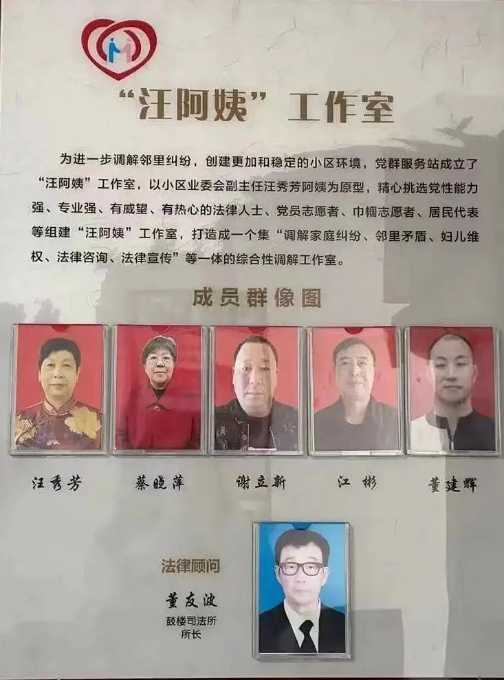 为进一步调解邻里纠纷,构建更加和谐稳定的小区环境,鼓楼街道朝圣门社区宋家湾新区5G工作站以小区业委会副主任汪秀芳阿姨为原型,精心挑选党性能力强、专业强、有威望、有热心的法律人士、党员志愿者、巾帼志愿者、居民代表等组建“汪阿姨”工作室,打造成一个集调解家庭纠纷、邻里矛盾、妇儿维权、法律咨询、法律宣传等一体的综合性调解工作室。