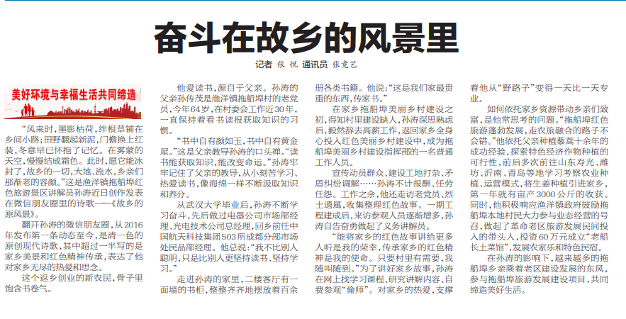 我推荐孙涛家庭,两口子敢闯敢干,爱学习,爱读书,是我们拖船埠村的代言人,是年轻一辈的好榜样。