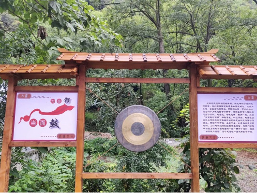 一边是锣,一边是鼓,相对而立,遥相呼应。锣,是一面直径80厘米的铜锣,轻轻一敲便发出清越明朗的声音。鼓,是神农架有名的“顶塘鼓”造型,下方刻着10个大字“鼓千年回响 扬浩然正气”。