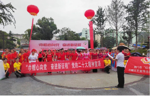 荆门市东宝区妇联、东宝区妇女健身协会在北门社区举办“巾帼心向党·奋进新征程”庆祝中国共产党成立102周年“荆门红色娘子军”庆“七一”文艺展演活动。活动现场,“红色娘子军”巾帼宣讲员作党的二十大精神宣讲,广大妇女群众通过广场舞、腰鼓舞、女声独唱、诗朗诵等多种形式表达了对党的无限热爱。
