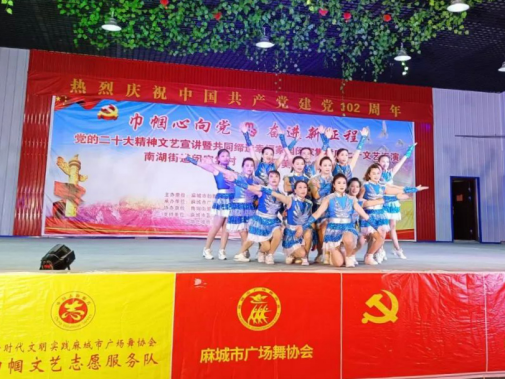 麻城市妇联、麻城市文化和旅游局、麻城市广场舞协会等单位共同举办了“巾帼心向党·奋进新征程”党的二十大精神文艺宣讲暨共同缔造幸福家园闵家集村庆“七一”文艺汇演。16支健身舞蹈队、320余名广场舞文体爱好者表演了《不忘初心》《和谐中国》等29个红歌红舞节目,跳出了他们的自信与风采,也舞出了他们对党的忠诚和对祖国的热爱。