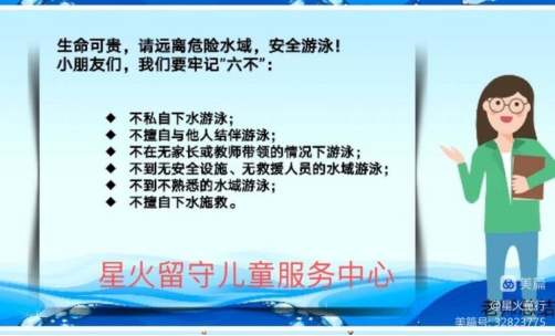 新洲区“爱心接力 筑梦童心”留守困境女童服务项目组为1100户家庭发放“致暑期儿童家长一封信”,信中强调儿童溺水的危险性,提前教育的必要性,希望家长们积极配合,重点教育孩子做到“六不”原则:一不私自下水游泳,二不擅自与他人结伴游泳,三不在无监护人或家长带领的情况下游泳,四不到无安全设施、无救护人员的水域游泳,五不到不熟悉的水域游泳,六不擅自下水施救。同时,对托管儿童开展“预防溺水”暑期安全教学,告诫儿童远离危险水域。