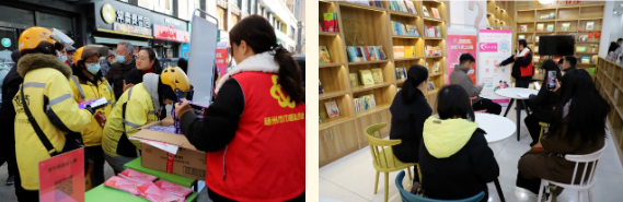 安陆市妇联与市法院携手走进网约配送员服务站点,赠送中国妇基会爱心物资,发放妇女权益?;ば植?。