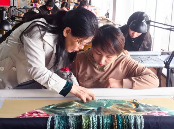黄石大冶市,汉绣传承人刘小红在“乡村振兴巾帼行动”培训班上为下岗失业妇女、留守妇女传授非遗技艺。