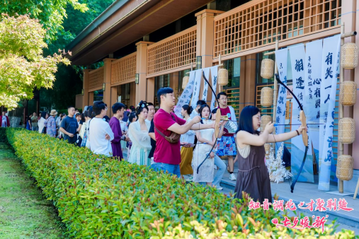 游园会上热闹非凡。投壶、捶丸、射箭、蹴鞠这些传统游戏区域,年轻人玩得很起劲,都拿出自己的看家本事。大家在游戏里活跃起来,赢了“宝钞”,就能换宋式茶果子、团扇、发簪这些小礼物。这些游戏和礼物,让大家更容易交流,慢慢打开心扉,表露心意,相处中渐渐有了好感。