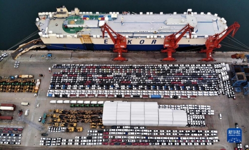商品车在山东港口青岛港码头等候装船(2022年8月7日摄,无人机照片)。新华社记者 李紫恒 摄