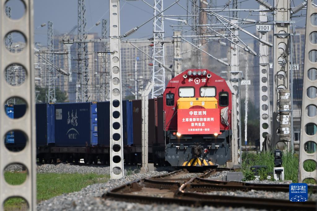 满载土库曼斯坦甘草中药材原料的中欧班列回程列车抵达西安国际港站(2022年8月31日摄)。新华社记者 李一博 摄