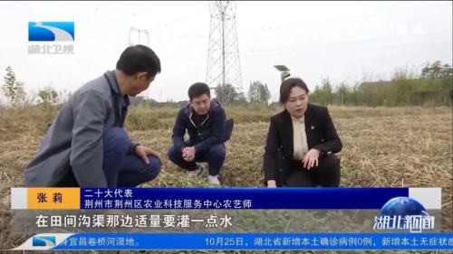 来不及休息调整,党的二十大代表张莉一回到荆州,就来到天河国富家庭农场,查看油菜成苗情况。