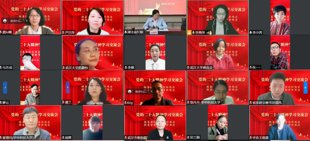 为深入学习领会贯彻党的二十大精神,把全体会员思想统一到党的二十大精神上来,把力量凝聚到党的二十大确定的各项任务上来,更好地做好妇女及家庭理论研究工作,11月8日,湖北省妇女理论研究会与湖北省家庭教育研究会联合举办线上学习交流活动。湖北省妇联党组成员、副主席彭艳红参加交流会并致辞,与会专家学者紧紧围绕党的二十大报告,结合自身研究与工作实际畅谈感想体会,学习讨论氛围热烈。